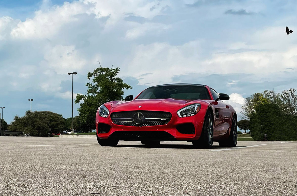 The joy of Parked Photography is finding a beautiful red Mercedes GT coupe ALONE in a parking lot against a beautiful blue sky.